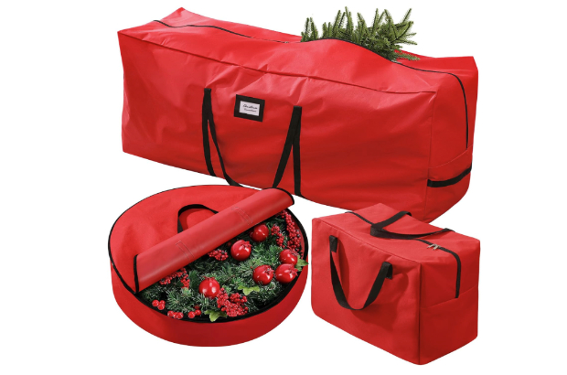 Deal with all your holiday decor with this three-pack set that includes a circular bag for your wreath, a square bag for decorations and a box-style bag for a 7.5-foot tree. The reinforced handles wrap around the tree bag to support the additional weight, and the square unit is ideal for tinsel, baubles and more.