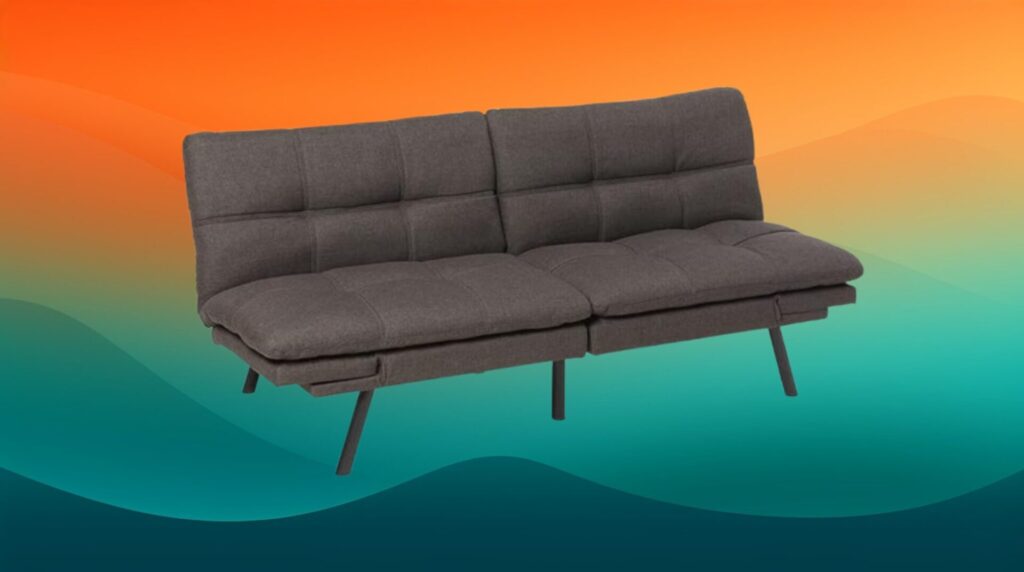 This convertible futon sofa bed is an excellent option for small spaces and minimalistic design. It’s memory foam make helps to cushion your back, neck, and legs, helping to relieve pressure. The linen fabric also helps add an extra layer of comfort for afternoon naps and peaceful tv-watching. One half of this sofa is able to recline flat whereas the other stays in position, making it easy to convert the futon from couch to bed.