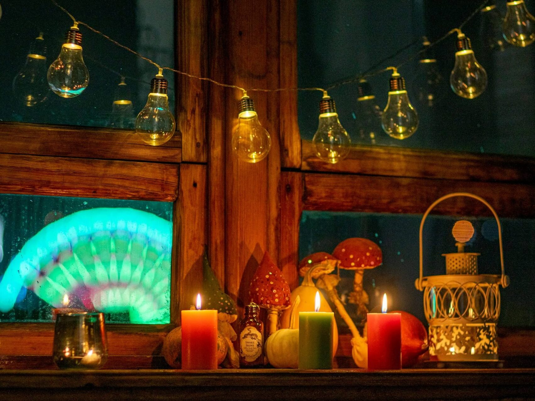 Experiment with colored bulbs in purple or amber for seasonal drama. A soft green glow behind plants can create an otherworldly effect. Think of lighting as your spellbook — it instantly controls the atmosphere.